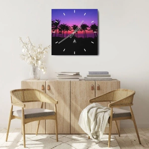 Väggklocka - Klocka på glas - Palmer vid solnedgången med en lila himmel - 30x30cm - Kväll under palmerna - Modern väggdekoration för vardagsrum, kök och sovrum ARTTOR