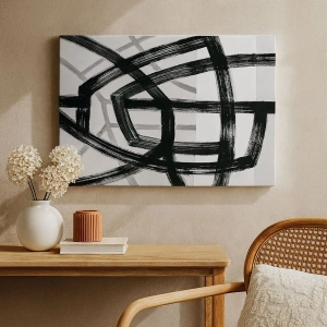 - En abstrakt målning som föreställer svarta och vita linjer som skär varandra mot en ljus bakgrund. Ett minimalistiskt och modernt motiv, perfekt för inredning, som ger klarhet och harmoni till ett utrymme. En perfekt dekoration för älskare av samtida k...