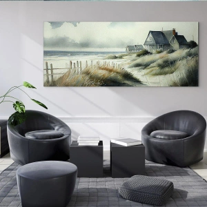 Glastavla - Bild på glas - Hus vid stranden i sanddynerna under en molnig himmel - 70x50cm - Borta från liv och rörelse - Modern väggdekoration för vardagsrum och sovrum ARTTOR
