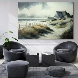 Väggmålning - Långt från den galna folkmassan - Hus på sanddynerna vid stranden under en molnig himmel