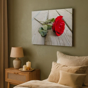 Canvastavla - Bild på duk - Röd ros på en träbakgrund - 70x50cm - En studie i scharlakansröd - Modern väggdekoration för vardagsrum och sovrum ARTTOR