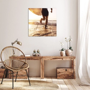 Väggkonst - Möta vågen - Surfare som springer på stranden med en bräda i solens sken