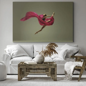 Det rosa tyget står i kontrast till den neutrala bakgrunden, vilket ger kompositionen djup och framhäver dansarens silhuett. Målningen utstrålar dynamik och energi, samtidigt som den bibehåller subtilitet och elegans. Denna stil passar perfekt i moderna, minimalistiska och klassiska utrymmen och skapar en inspirerande atmosfär i interiören.