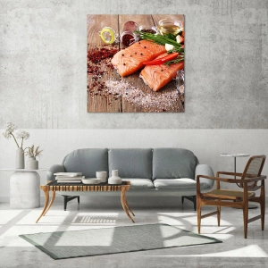 Glastavla - Bild på glas - Laxfiléer med kryddor på en träbänkskiva - 70x50cm - Norskt äventyr i köket - Modern väggdekoration för vardagsrum och sovrum ARTTOR