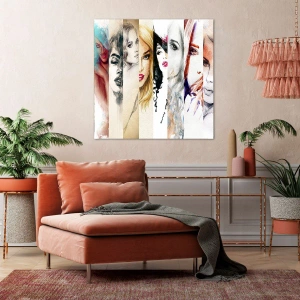 • Denna målning presenterar en serie porträtt av kvinnor, utförda i en mängd olika konstnärliga stilar. Mångfalden av färger och tekniker gör den till ett unikt tillskott till alla interiörer.