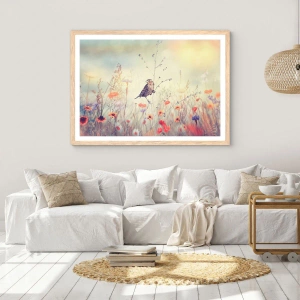 Affisch i ram av ljusek - Fågelporträtt med en äng i bakgrunden - 40x40 cm