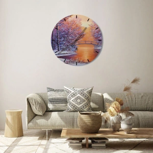 Väggklocka - Klocka på glas - Vinterlandskap med en bro över en flod, träd och snö - 30x30cm - Låt oss mötas här - Modern väggdekoration för vardagsrum, kök och sovrum ARTTOR