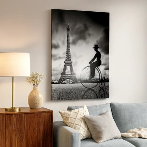 - Målningen avbildar en man som cyklar på en retrocykel mot Eiffeltornets bakgrund i svartvitt. Elegans och nostalgi förenas i en harmonisk komposition som fångar atmosfären från Belle Époque.