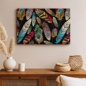 - Canvastavlan "Bird Carnival" avbildar en mängd färgglada fjädrar mot en svart bakgrund. Dess slående kontrast och noggrannhet i detaljer gör den till ett perfekt tillskott till alla moderna och eleganta inredningar.