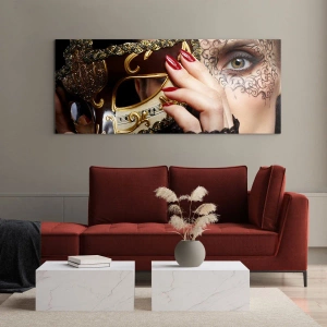 Glastavla - Bild på glas - En gyllene venetiansk mask på en kvinnas ansikte - 70x50cm - Min värld är från barock - Modern väggdekoration för vardagsrum och sovrum ARTTOR