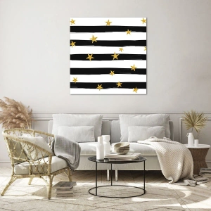 Glastavla - Bild på glas - Svarta och vita ränder med guldstjärnor - 70x50cm - Alla är vi födda under lycklig stjärna - Modern väggdekoration för vardagsrum och sovrum ARTTOR
