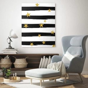 Ränder i klassiska nyanser av svart och vitt introducerar harmoni och ordning, medan guldstjärnor ger en unik karaktär och elegans till helheten. Ränder, Stjärnor och Guld skapar en harmonisk komposition som glädjer och drar till sig uppmärksamhet.