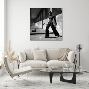 "Urban Elegance" är en extraordinär glasmålning på 70x50 cm, som avbildar ett svartvitt fotografi av en kvinna i en elegant outfit mot en urban miljö. Kombinationen av en minimalistisk komposition och en skarp arkitektonisk bakgrund skapar ett verk av sofistikering och klass.