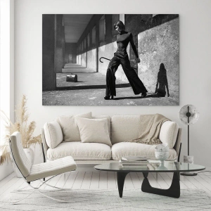 - Ett glastryck med ett svartvitt fotografi av en kvinna i elegant klädsel mot ett kargt urbant landskap. En perfekt dekoration för älskare av minimalism och modernitet.