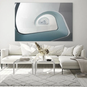 - Målningen avbildar en modern spiraltrappa, presenterad ovanifrån i ett abstrakt perspektiv. Nyanser av blått, vitt och grått dominerar, vilket skapar en minimalistisk rumslig komposition.