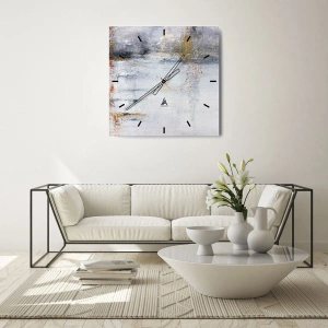 Målningen avbildar en abstrakt komposition som domineras av Grått, Vitt och Guld. De subtila färgerna skapar intrycket av en lätt luftridå, full av finess och elegans. Klockan kännetecknas av en minimalistisk men sofistikerad stil som smälter perfekt in i en modern interiör.