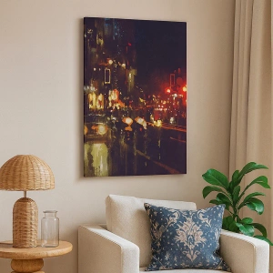 - Målningen avbildar en nattlig stadsscen med färgglada ljus och gatureflektioner. Denna dynamiska komposition, full av energi och en modern atmosfär, kompletterar perfekt urbana och eleganta inredningsstilar.