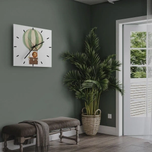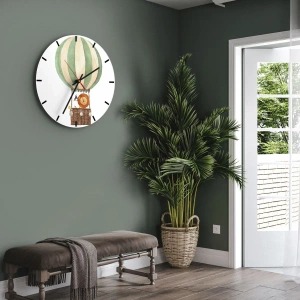 Väggklocka - Klocka på glas - Ett lejon och en anka i en ballong på en vit bakgrund - 30x30cm - Leons resor - Modern väggdekoration för vardagsrum, kök och sovrum ARTTOR