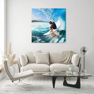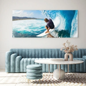 Glastavla - Bild på glas - Surfare i en vattentunnel med havet i bakgrunden - 70x50cm - Dansar med vågorna - Modern väggdekoration för vardagsrum och sovrum ARTTOR