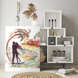 - Denna konstnärliga akvarellmålning avbildar ett romantiskt par i en tropisk miljö omgiven av palmer. Det är den perfekta dekorationen för älskare av unik atmosfär och vackra stunder.