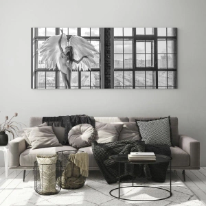 Glastavla - Bild på glas - Ballerina med änglavingar i svart och vitt - 70x50cm - Änglarnas stad? - Modern väggdekoration för vardagsrum och sovrum ARTTOR
