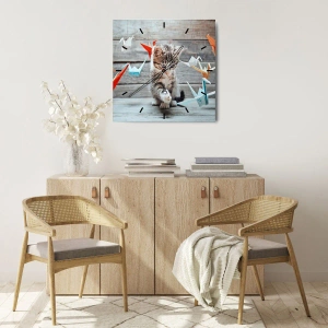 Väggklocka - Klocka på glas - En katt som leker med origamikranar - 30x30cm - Första lektionen - Modern väggdekoration för vardagsrum, kök och sovrum ARTTOR