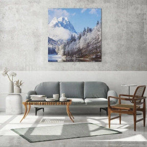 Kompositionen domineras av snöns intensiva vita färg, himlens djupblå färg och barrträdens mörkgröna accenter. Målningen innehåller en mängd detaljer: från de fina grenarna täckta av snö till den nästan fotografiska reflektionen av bergen i vattnet. Denna realistiska form ger verket en unik karaktär, vilket gör det perfekt för utrymmen där natur och tystnad råder.