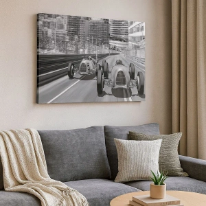 Canvastavla - Bild på duk - Monokrom retro bilrace scen - 70x50cm - För länge sedan i Monte Carlo - Modern väggdekoration för vardagsrum och sovrum ARTTOR