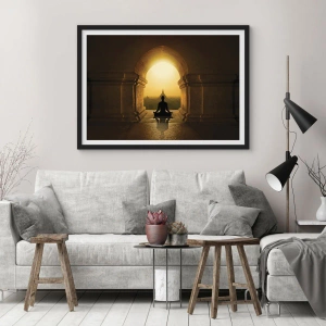 Affisch i svart ram - En figur som mediterar i ett tempelvalv mot bakgrund av den uppgående solen - 50x70cm - Full harmoni - Modern väggdekoration för vardagsrum och sovrum ARTTOR