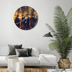 • En väggklocka med en folkmassa under paraplyer mot en nattlig stadsbakgrund. En perfekt accent för stämningsfulla och konstnärliga interiörer.