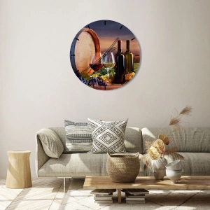 - Denna väggklocka har ett motiv av vin, glas och fat mot en pittoresk solnedgång i bakgrunden. Perfekt för vinälskare och rustika inredningar.