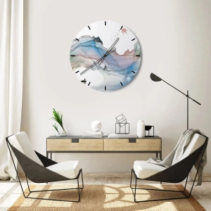 - En väggklocka med ett konstnärligt motiv av berg i pastellfärger och en båt som flyter på vattenytan. Kompositionen ger harmoni, frid och inspirerar till lugn. Perfekt för moderna inredningar.