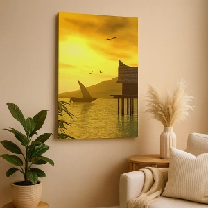 Canvastavlan "Longed For Peace" avbildar en pittoresk tropisk solnedgång över vatten, där ett trähus på pålar skapar en unik miljö. Himlens varma, gyllene färger reflekteras i vattnet och skapar en atmosfär av avkoppling och harmoni. En segelbåt vid horisonten och flytande fåglar ger dynamik och liv åt kompositionen.