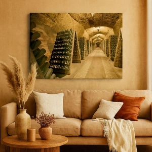 Skapad på premiumcanvas utmärker sig konstverket för sin färgbeständighet och precision i detaljerna. Formatet 70x50 cm gör den till ett perfekt dekorativt element i ett vardagsrum, matsal eller vinkällare. Trycktekniken framhäver detaljer som stenens struktur och flaskornas arrangemang, vilket ger kompositionen en realistisk känsla.