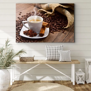 Canvastavla - Bild på duk - En kopp kaffe med kanel och anis på en bakgrund av kaffebönor - 70x50cm - Rotsmak och -arom - Modern väggdekoration för vardagsrum och sovrum ARTTOR