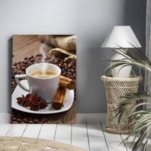 - Målningen föreställer en kopp aromatiskt kaffe med kanel och anis, mot en bakgrund av kaffebönor. Det är det perfekta tillskottet till kök, matsal eller kafé, och förhöjer värmen och mysigheten i alla interiörer.