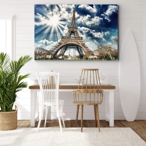 - Målningen föreställer Eiffeltornet, omgivet av solljus, mot en dynamisk, molnig himmel. En ikon för Paris i all sin prakt, den perfekta dekorationen för älskare av arkitektur och romantiska landskap.
