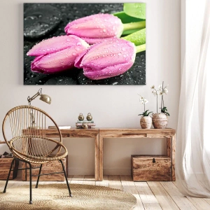 Canvastavla - Bild på duk - Tre rosa tulpaner med vattendroppar på svart bakgrund - 70x50cm - Tre i lila färg på en sten - Modern väggdekoration för vardagsrum och sovrum ARTTOR