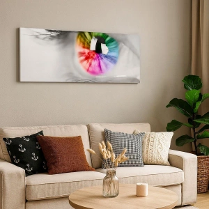 - Denna målning föreställer en konstnärlig avbildning av ett öga med en regnbågsfärgad iris mot en grå bakgrund. Perfekt för interiörer inspirerade av modernitet och en kreativ stil.
