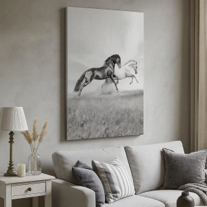 - Denna målning föreställer två galopperande hästar i en dynamisk svartvit komposition. Det är den perfekta dekorationen för djurälskare och de med en elegant stil.