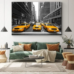 Vi är stadens färg är en modern canvastavla som fångar atmosfären i en av världens mest igenkännbara metropoler. Den avbildar de livliga gatorna i New York med gula taxibilar i förgrunden, i kontrast till byggnadernas monokromatiska bakgrund. Denna komposition fångar perfekt dynamiken och energin i livet i en storstad.