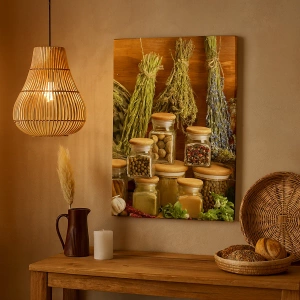 Köksmagi är en canvastavla som ger värmen och harmonin i en rustik stil till din inredning. Den avbildar örter och kryddor i glasburkar, omgivna av torkade knippen av aromatiska örter. Träbakgrunden ger kompositionen en naturlig karaktär, och detaljrikedomen skapar en unik och inspirerande atmosfär.