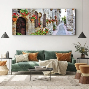 "Italiensk atmosfär" är en canvastavla på 70x50 cm som transporterar oss till en pittoresk medelhavsby. Den smala gatan omgiven av stenbyggnader, dekorerad med färgglada blomkrukor, skapar en varm och atmosfärisk miljö som gläds med sin harmoni och estetik.