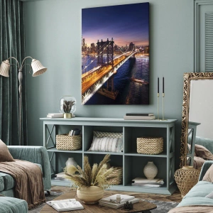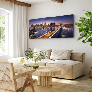 Canvastavla - Bild på duk - Bron och stadspanoraman vid solnedgången - 70x50cm - Över ljusbron till stadens hjärta - Modern väggdekoration för vardagsrum och sovrum ARTTOR