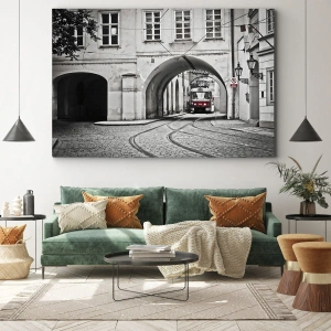 Canvastavla - Bild på duk - En svartvit spårvagn på en historisk stadsgata - 70x50cm - Genom stadens labyrint - Modern väggdekoration för vardagsrum och sovrum ARTTOR