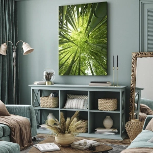 Canvastavlan "I en bambulund" är ett förslag för naturälskare och harmoniska människor. Den avbildar majestätiska bambuträd sedda underifrån, vilket skapar en extraordinär komposition full av grönska och ljus. Detta unika konstverk introducerar en atmosfär av lugn och avkoppling i interiören.
