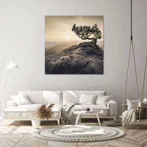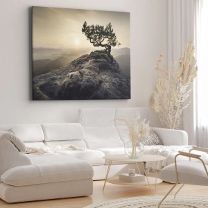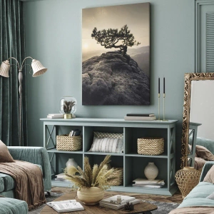 - Denna canvastavla föreställer ett ensamt träd på en klipptopp upplyst av den nedgående solen. Perfekt för inredningar som värdesätter harmoni och natur.