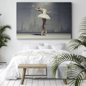 - Denna canvastavla föreställer en balettdansös i vit klänning mot en skarp vägg. Perfekt för inredningar som värdesätter konst och minimalism.