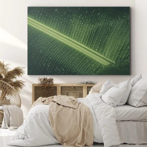 - Denna målning avbildar ett grönt löv täckt av vattendroppar. Det naturliga motivet och de uttrycksfulla detaljerna ger interiörer en fräschör och harmoni, och integrerar perfekt biofilisk design.
