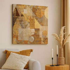 Tack vare de varma färgerna, som brunt och guld, introducerar målningen en känsla av mysighet och komfort i interiören. Geometriska former ger en modern touch och betonar den raffinerade estetiken i hela inredningen.